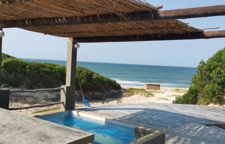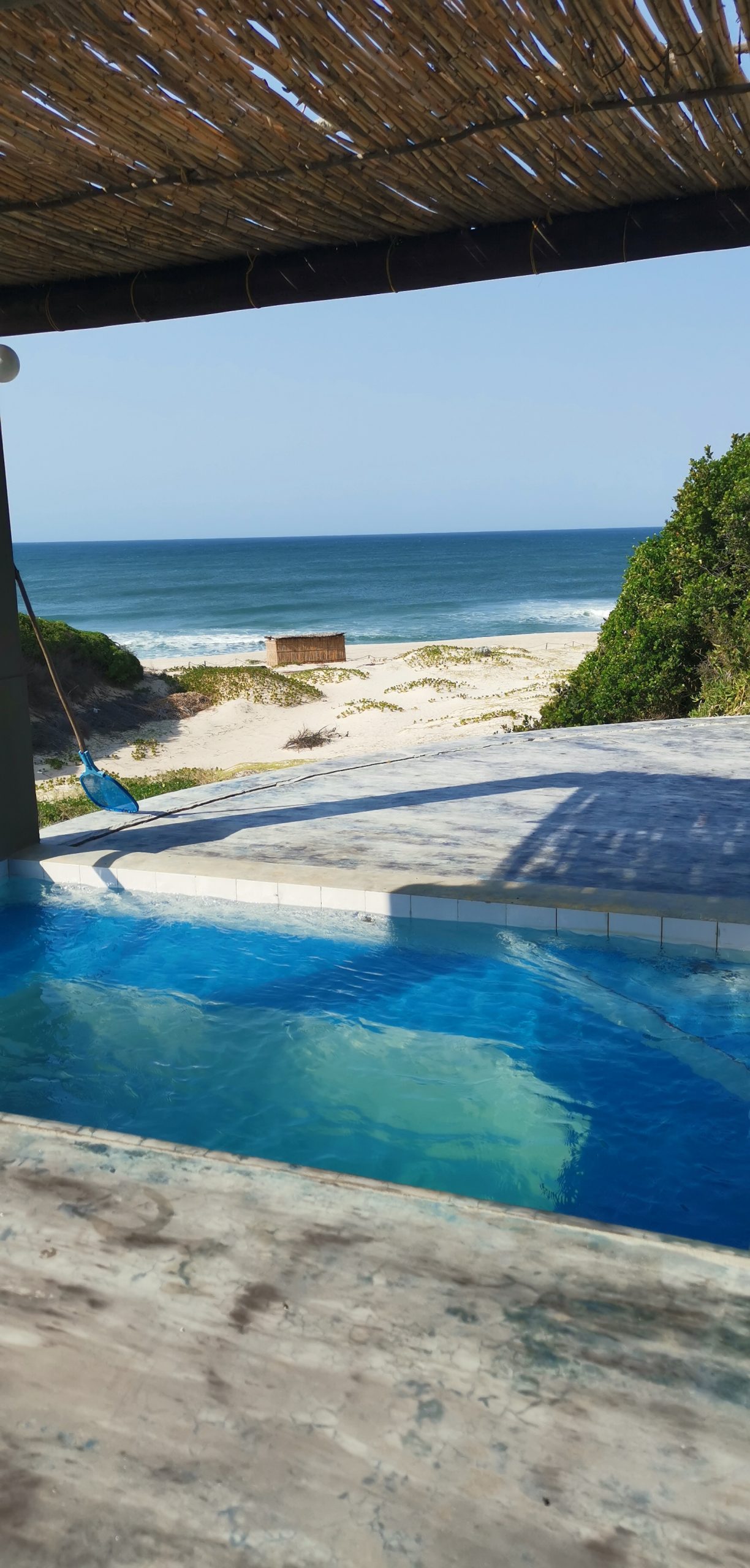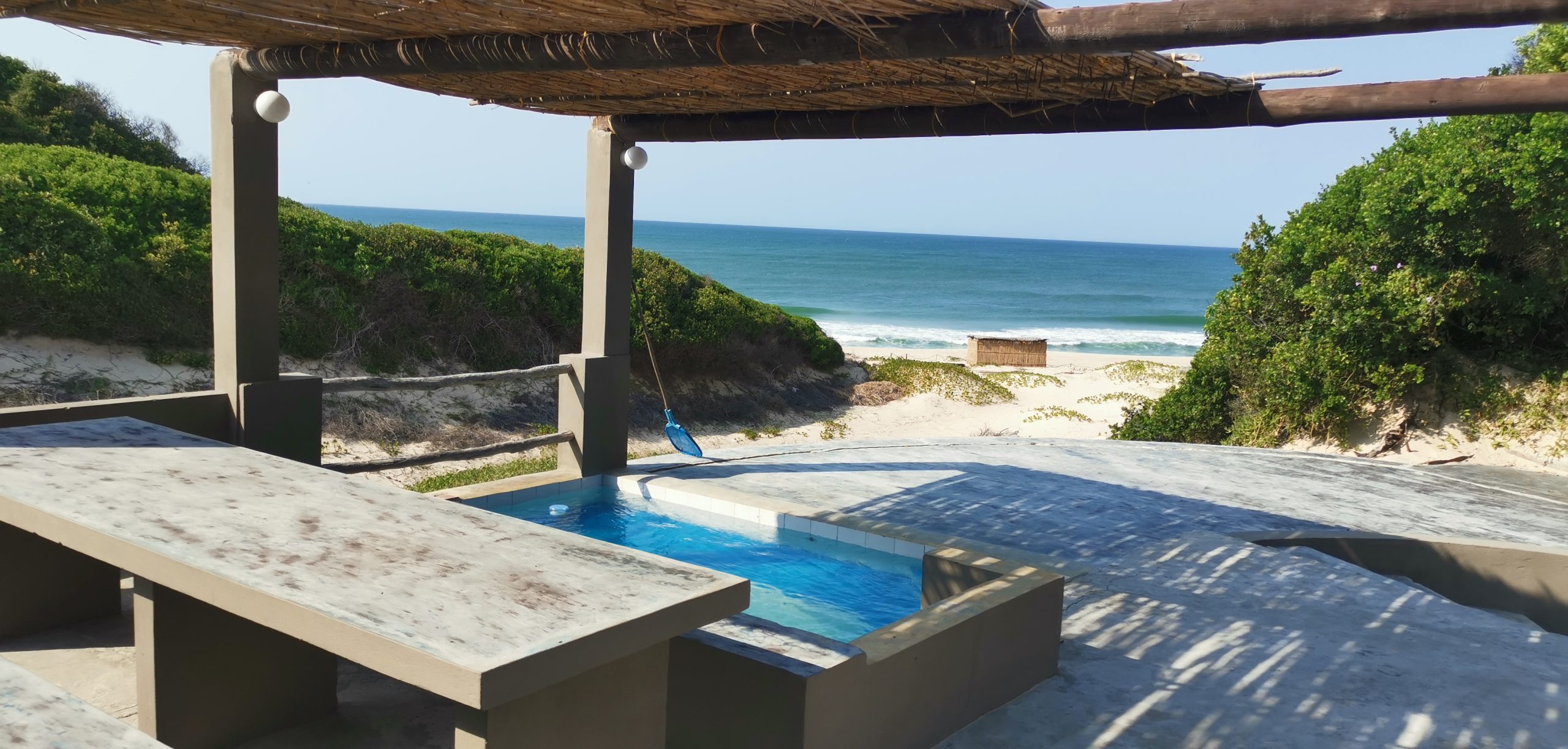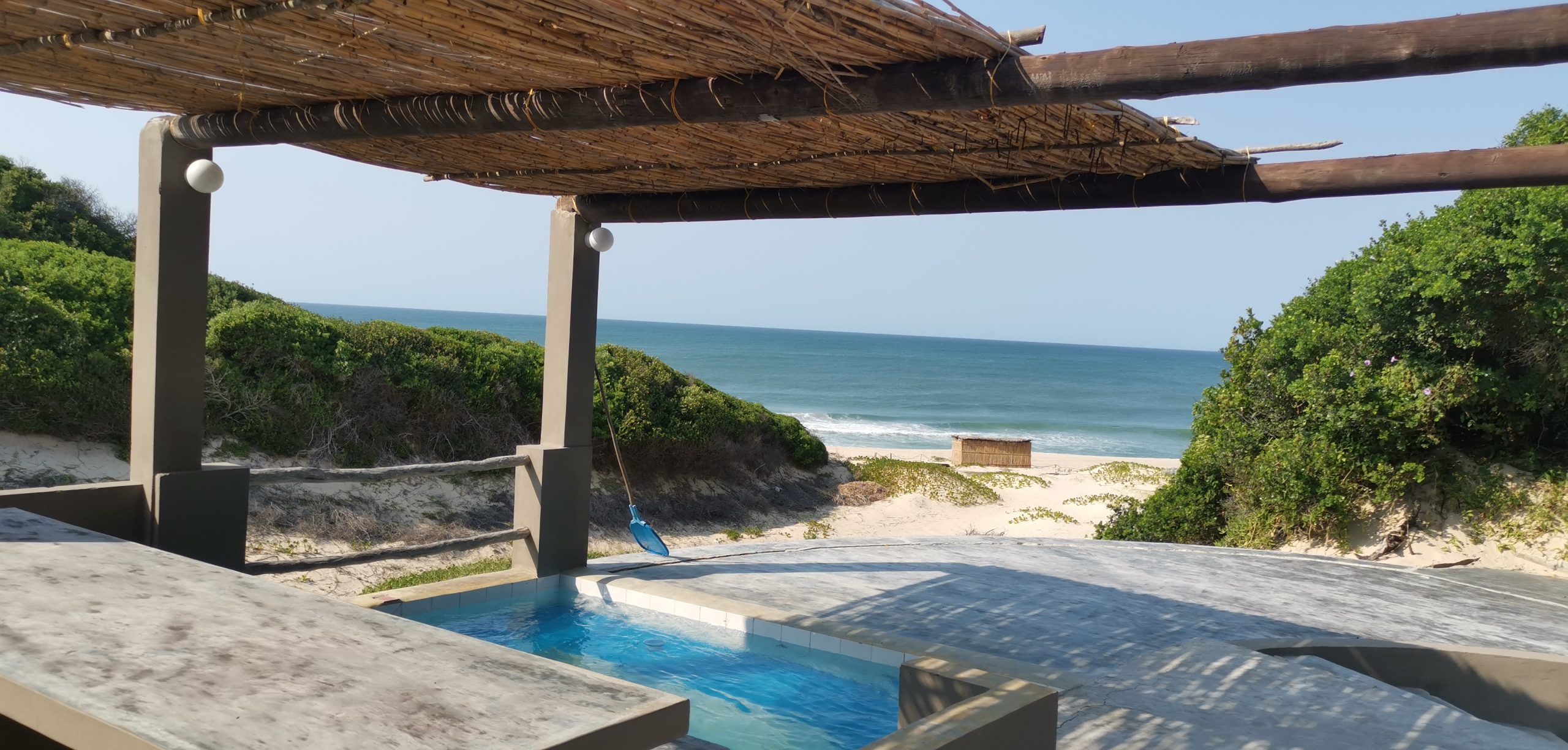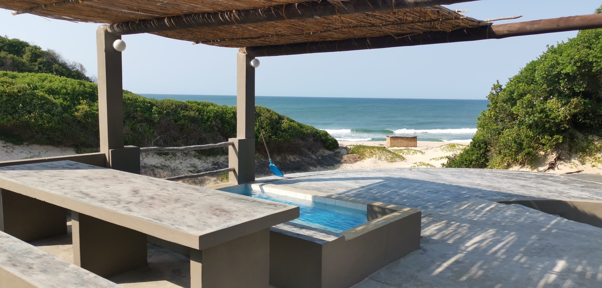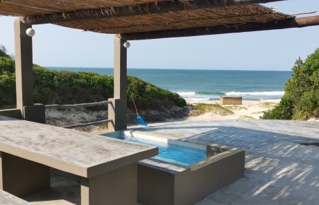 This 4 bedroom, 2 bathroom self catering holiday beach house has its own private splash pool and is 100m from the beach with magnificent sea views. Sleeping a minimum of 8 people and maximum 15 – 18 people. There are 4 double beds & 7 single beds. 3 single bed bunks in the living area. Large open plan, self-catering equipped kitchen/living area with 4 plate gas stove, fridge freezer facilities and a built-in braai. Patio doors opening up onto a stoep with private splash pool and magnificent beach and ocean views. This secluded and safe beach resort is ideal for the family break away or the adventurer.
